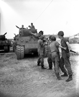 Cleaning a tank are ; back to front, Sergeant Albert DeLeon, Sergeant James L. Booth, Corporal Billy Cruson, and Private John Coleman. On turret, left to right, are Private Aubrey E. Napier, Sergeant First Class R. D. Evans, Sergeant First Class Bill Anthony. All are members of Company D, 145th Tank Battalion. Published in Fort Worth Star-Telegram morning edition June 24, 1951.