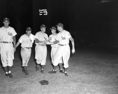 Mondorff gets congratulations after delivering winning hit for eighth victory. Left to right, Bob Bundy, Mondorff, Bill Hunter and Don Otten. Published in Fort Worth Star-Telegram evening edition, June 25, 1951.