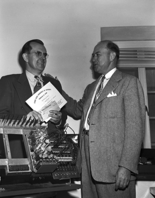 Emil H. Gisel, left, Civil Aeronautics Administration (CAA) maintenance technician, is shown holding a cash award check and certificate of commendation from the CAA national administrator as he explains to L. C. Elliott, CAA regional chief, the operating principle of a machine Gisel invented to test teletypes which select and relay weather messages. CAA has decided to adopt Gisel's invention nationwide.