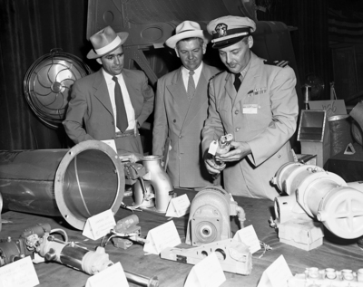 Inspecting a gust lock cylinder for a B-36 at the Armed Forces Small Business Exhibit in Will Rogers Memorial Coliseum are, left to right, F. D. Harrell and T. J. Small, metal hamburgers stand manufactures of Austin, and Lieutenant G. A. Tourville of the Navy's bureau of aeronautics. Published in Fort Worth Star-Telegram evening edition June 25, 1951.