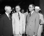 Among those who joined in a ceremony opening the Armed Forces Small Business Exhibit were left to right, Mayor J. R. Edwards, William J. McBrian, vice chairman of the munitions board, and City Manager W. O. Jones. Published in Fort Worth Star-Telegram morning edition June 26, 1951.