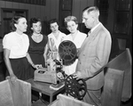 R. E. Dysart, in charge of civil defense, demonstrates a projector before showing a film, "You Can Beat the A Bomb," to a group at Grace Methodist Church. Others, left to right, are Mmes. Fred Giles, W. W. Williams, E. E. Searcy, C. B. Martin.