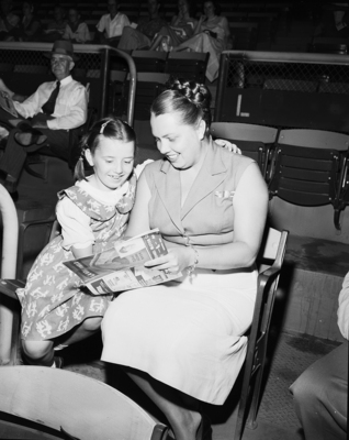 Cissie Bragan, daughter of the Cats' manager, sees Bobby's picture on score card held by Mrs. Bragan. Cassie approves of her father's play - except for his running.