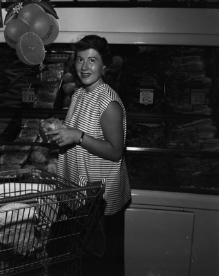 Mrs. Rex Barney tests the fresh vegetables in a Fort Worth super-market. Both she and her husband are from Omaha. They have one daughter.
