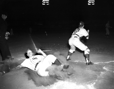 Bob Bundy bounces in with Cats' lone run in fourth inning. He scored from third on Mickey Livingston's fly to center field. Catcher is Beaumont's Elvin Tappe. Published in Fort Worth Star-Telegram evening edition, June 27, 1951.