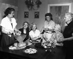 Miss Frances Dekle, Mmes. D. J. Mize, Earle Pace, and J. W. Cannon, and Mrs. E. E. Dekle, left to right. They are all house guests of Mrs. J. L. Pritchett, right, at her home. They are having punch and cookies. Published in Fort Worth Star-Telegram evening edition June 29, 1951.