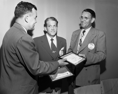 H. W. McGowan, left, chairman of the merit award committee of the Fort Worth chapter of National Office Management Association, presents the first Leffingwell Awards given by the local group to Joe Pieringer Jr., left, and Jesse Bain. Lewis Dunn, another winner, was not present at the meeting. Published in Fort Worth Star-Telegram morning edition June 27, 1951.