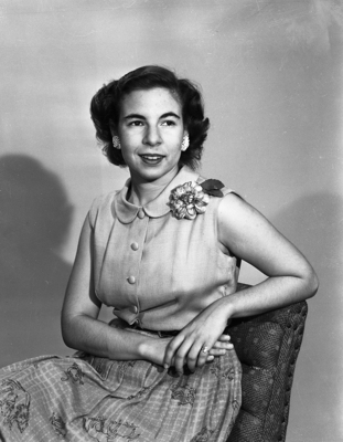 Image of Dot Adler, she is the daughter of Mr. and Mrs. Melvin F. Adler, 3008 Cockrell. A recent Paschal graduate, she works at Fort Worth Star-Telegram Jr. as a copy girl. Published in Fort Worth Star-Telegram July 1951.