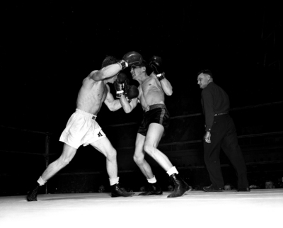 James Wortham of Amarillo (right) flattens the nose of Houston's Wallace Willard in middleweight finals. However, Willard went on to register a unanimous decision. Published in the Fort Worth Star-Telegram morning edition, February 22, 1950.