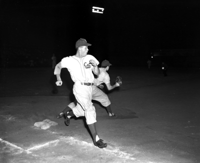 Cats' Bill Hunter races across first base ahead of throw to Fenton Mole in fourth inning. It stopped attempted double play. Published in Fort Worth Star-Telegram morning edition, July 28, 1951.