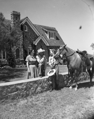 Anna Kamstra, 25-year-old Dutch newspaper woman, is getting a good taste of Texas ranch life at the John Will Vance Golden Hoofs Farms near Santa Anna. She stands in front of the ranch home with Mr. and Mrs. John Vance after getting back from her first horseback ride.
