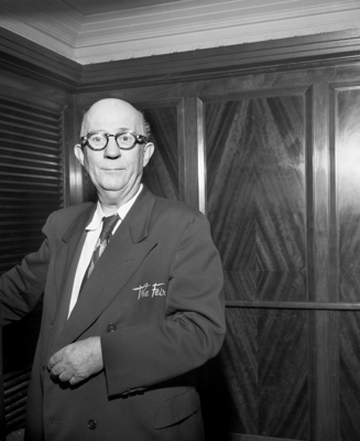 Pete Gossett, a former WBAP trombone player. is shown wearing a suit with the words "The Fair" embroidered and smiling at the camera. Published in Fort Worth Star-Telegram morning edition June 29, 1951.