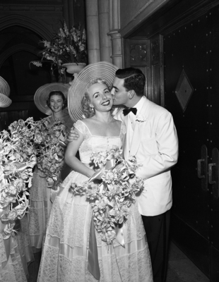 Series on Suzanne Mosser-Charles Coffield wedding. A man kissing a bridesmaid on cheek.