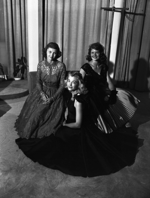 These three sponsors of the Texas Cowboy Reunion will model fall fashions presented by Meacham's of Fort Worth at 11 a. m. Tuesday in Round-Up Hall in Stamford. Margaret Free of Haskell, left, is wearing Oleg Cassini's brilliant blue lace dress with long sleeves, scalloped skirt and rhinestone buttons. Train-Norell's "Black Star" silk organza is shown by Janet Ransom, Perryton, center. June Prichard of Seymour model's Elfreda's black lace blouse with gunmetal brown pleated taffeta skirt.