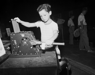 Michael Hitch, 7-year-old son of Mr. and Mrs. Robert M. Hitch, 259 Parkside Drive West, gets the feel of a B-47 stratojet bomber landing gear control, one of the thousands of items on display at the Armed Forces Small Business Exhibit at Will Rogers Memorial Coliseum Saturday.