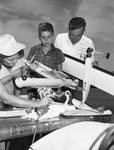 Mrs. June Huffman, secretary of the Plymouth regional model airplane contest staged Sunday at Forest Park, weighs in a plane for David Ramsey, 13, of Abilene, junior stunt winner. Waiting is Marvin Wright, 18, of 732 Ernest, who won the free flight contest Saturday.