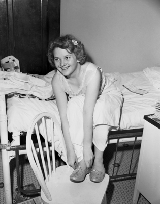 Gaynelle Evans, 16 is putting on house shoes while smiling. She took her first step in 60 days after she fractured her back jumping our of a second story window. She wore a plaster cast for 2 months and will wear a brace for another 2 months.. Published in Fort Worth Star-Telegram morning edition June 30, 1951.