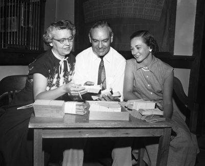 Mrs. J. B. Morgan, left, TCU football ticket manager; Business Manager Amos Melton and Secretary Mary Schwartz shuffle tickets to Frogs' 1951 games. Season ticket sales opened Monday.