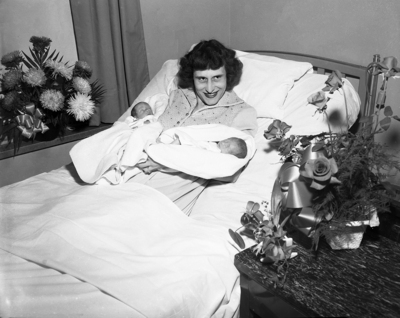 Mrs. R. B. Brown, nurse at St. Joseph's Hospital where she specialized in obstetrics, has assisted in the arrival of hundreds of babies. She always liked twins. Now she has some of her own - Melody and Melinda, born prematurely. Published in Fort Worth Star-Telegram evening edition July 9, 1951.