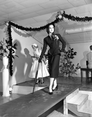 With Style - Carolyn Gynes, model for Meacham's Fort Worth store presenting the show, models Molly's black suit with a poppy umbrella.