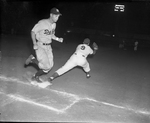 Dallas' Lou Farotto strides safely across first base in fifth inning of game at La Grave Field to stop an attempted double play by the Cats. Ben Taylor stretches for the throw from second. Published in Fort Worth Star-Telegram morning edition, July 4, 1951.