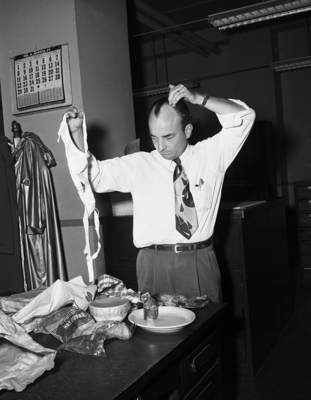Image shows of Thurman Berry of Star-Telegram Jr, going through the leftover he brought in from Dispatch Department's 3rd annual picnic at his home on Eagle Mountain Lake. Published in Fort Worth Star-Telegram July 1951.