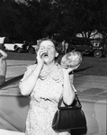 Forest Park Crowd Sheds Care For Holiday Fun - Fort Worth citizens frolicked in Forest Park Wednesday afternoon in a two-hour round of games and contests sponsored by the City Recreation Department before turning to formal solemnities commemorating the Fourth. Mrs. E. L. Jeffries of 820 Bryce, displays the ham she won in a hog-calling contest and demonstrates the style that earned her the prize.