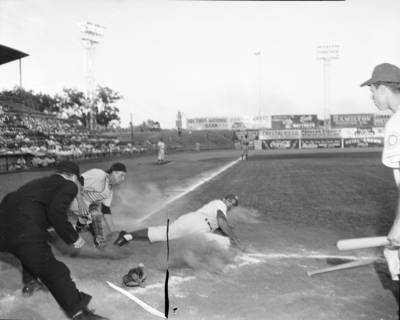 Manager Bobby Bragan of Cats scores from third base on single to right field. Bragan held up briefly to make certain Pitcher Pete Mondorff's blow in second inning of opener would drop safely. Umpire is Buster Capps and Catcher is Tulsa's Dewey Williams. Cats won both games. Published in Fort Worth Star-Telegram evening edition, July 5, 1951.