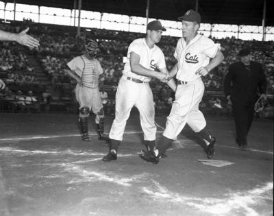 Cat Bob Bundy crosses the plate after hitting his three-run homer in the second inning of first game at La Grave. That's Ben Taylor offering a congratulatory hand. Published in Fort Worth Star-Telegram morning edition, July 5, 1951.