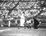 Ben Guintini, new Cat outfielder, slaps a single into left field on his first trip to the plate in a Fort Worth uniform. Note how Umpire Buster Capps and Catcher Dewey Williams of the Oilers follow flight of ball. Hit preceded Bob Bundy's homer, and was part of four-run spree. Published in Fort Worth Star-Telegram morning edition, July 5, 1951.