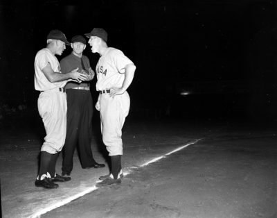 Umpire Andy Andrews stands with fixed features while Manager Al Vincent, left, of the Oilers and Third-baseman Ralph Lapointe assault his ears. Andrews had called Ben Taylor safe at third in fourth inning. Vincent and Lapointe disagreed. Two men having an angry expression conversation wearing baseball uniforms. Another man is in the center looking at the two men very puzzled in his expression wearing dark clothes and hat. Published in Fort Worth Star-Telegram morning edition, July 6, 1951.