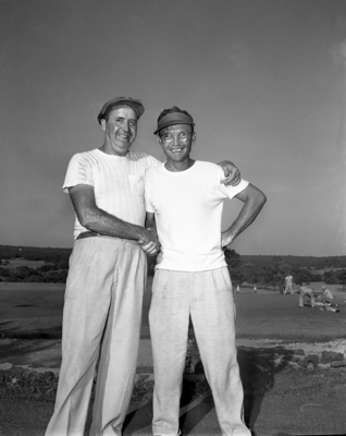 Hawk Howell, left, is congratulated by Woody Duncan after winning playoff in Meadowbrook Gold Association's 36-hole medal tournament. They tied at 137 for regulation distance. Published in Fort Worth Star-Telegram evening edition July 5, 1951.