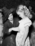 In Gay Nineties costumes, Mrs. W. R. Stanley and daughter Martha. Mrs. W. R. Stanley is fixing Martha's dress. Published in Fort Worth Star-Telegram evening edition July 5, 1951.