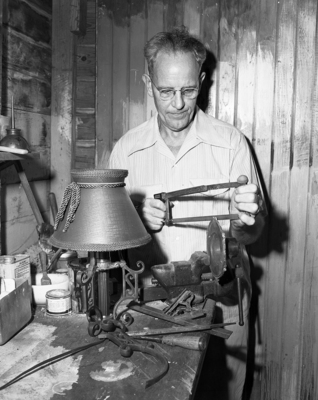 Reverend Thomas Sterck, pastor of Matthews Memorial Methodist Church, finds relaxation at his work bench in the garage of his home. Published in Fort Worth Star-Telegram evening edition July 7, 1951.