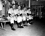 The Tulsa quartet faces Cats in a two-game series opening here and three-game set at Tulsa. Left to right, Catcher Dewey Williams and Pitchers Jim Blackburn, Joe Nuxhall, and John Stewart. Four men sitting down in a locker-room smiling side by side. They have on Baseball uniforms. Published in Fort Worth Star-Telegram evening edition, August 29, 1951.