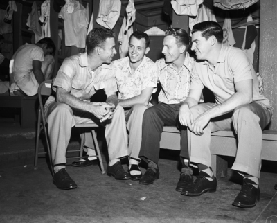 Jack Lindsey, Bill Hunter, Bob Bundy, and Ben Taylor. Four men sitting down in a locker room wearing casual clothing huddled up together. There is a man in a ball behind them in the locker room unknown named.