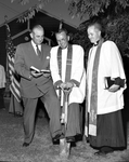 Reverend C. Avery Mason, bishop of the Diocese of Dallas, center, breaks ground for the new St. John's Episcopal Church and parish house. Lionel Bevan, building committee chairman, left, and Reverend John. R. Leatherbury, rector look on during the ceremony. Published in Fort Worth Star-Telegram morning edition July 6, 1951.