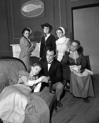 Bobbye Russell as the heroine Lady Isabel Vane takes time out on the sofa in this scene from Texas Christian University's "East Lynne", old-fashioned "meller-dramer" to be staged. Kneeling beside the heroine is Lewis Davis. Others, left to right, are Beth Kayser, Mrs. June Chapman, Lonnice Dotson and Peggy Meade. Published in Fort Worth Star-Telegram evening edition July 9, 1951.