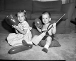 Sheila Johnson (left) and J. Lee Johnson IV, the children of Mr. and Mrs. J. Lee Johnson III, are seen seated on the floor playing with balloons. J. Lee Johnson is also holding a small broom.