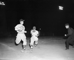 Catcher Wayne Mason of Adamson barely beats throw of Coca-Cola's Third Baseman Don Burns as Jimmy Mayfield stretches for ball. Play occurred in third inning of American Legion bi-district game which Coca-Cola won, 5-4. Published in Fort Worth Star-Telegram morning edition, July 21, 1951.
