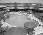 The picture shows the swimming pool in the patio with thatched-roof cabanas in the background at the Western Hills Hotel, which will be partially open to guests soon. Published in Fort Worth Star-Telegram morning edition July 8, 1951.