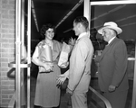 Glass doors swing open automatically when the shopper steps on the magic mat at the new Safeway Store. The trio, left to right, show how it is done: Miss Viola Sinclair, with arms laden with food; Alton F. Skipper, store manager, and G. W. Bluethman, district manager, who is entering the store through an adjoining door. Published in Fort Worth Star-Telegram morning edition July 8, 1951.