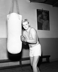Welton Ritchie, Cleburne High, is working out at the Golden Gloves- National Guard gymnasium, getting ready for a football game. He's on South All-Star squad, and wants to be starting tackle in the game at San Antonio. He weighs 200. Published in Fort Worth Star-Telegram morning edition July 8, 1951.