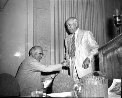 Star-Telegram "Service Pin" dinner at Hotel Texas. Amon G. Carter, standing, is seen shaking hands with an unidentified man, seated.