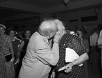 Managing Editor James R. Record greets another 40-year worker, Miss Lena Goerte, with a surprise kiss of congratulations. Published in Fort Worth Star-Telegram July 1951.