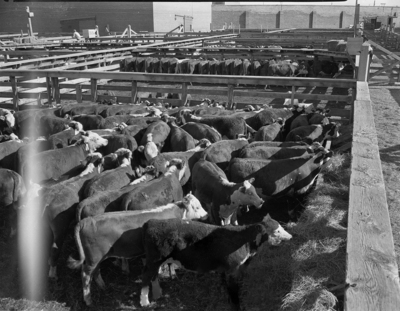 Well-filled pens at Fort Worth stockyards in what looked like biggest cattle run of the year were in sharp contrast to empty lots of recent months as hundreds of truckloads of livestock rolled in from drying grasslands for unloading and steady sales. Published in Fort Worth Star-Telegram evening edition July 9, 1951.