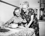 Mrs. Addie Barnes treats her son, Corporal Dorris Barnes, to a home-cooked cake, one of the things he missed most while in Korea. Corporal Barnes will leave for Fort Sill, Oklahoma. Published in Fort Worth Star-Telegram morning edition July 10, 1951.