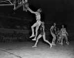 Image shows a basketball game between Texas Christian University (TCU) and Texas A&M. TCU's Gene Schmidt leaps to make a shot in TCU's losing battle with Texas A&M, he missed.