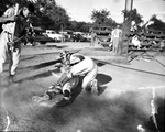 Joe Middlebrook of Coca-Cola slides under Catcher Bill Maley of Topsey's in third inning of American Legion game, but it's too late and he's out stealing. Coca-Cola won game and title, though 10-0. A baseball male player sliding on the field wearing pads and a mask. Another male baseball player is standing up over him. Published in Fort Worth Star-Telegram evening edition, July 11, 1951.
