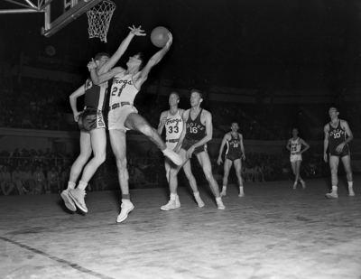 image shows a basketball game between Texas Christian University (TCU) and Texas A&M. James Knox (21) draws back and connects a hook shot, giving TCU a 22-20 lead in the first half. Guarding is Marvin Martin (13), looking on are George McLeod (33) and Walter Davis (16).